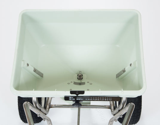 A szórási mennyiség (átfolyási keresztmetszet) egy számozott tekerővel pontosan beállítható. Minél nagyobb állásra van állítva a csúszka, annál nagyobb mennyiség fog kiszórásra kerülni.